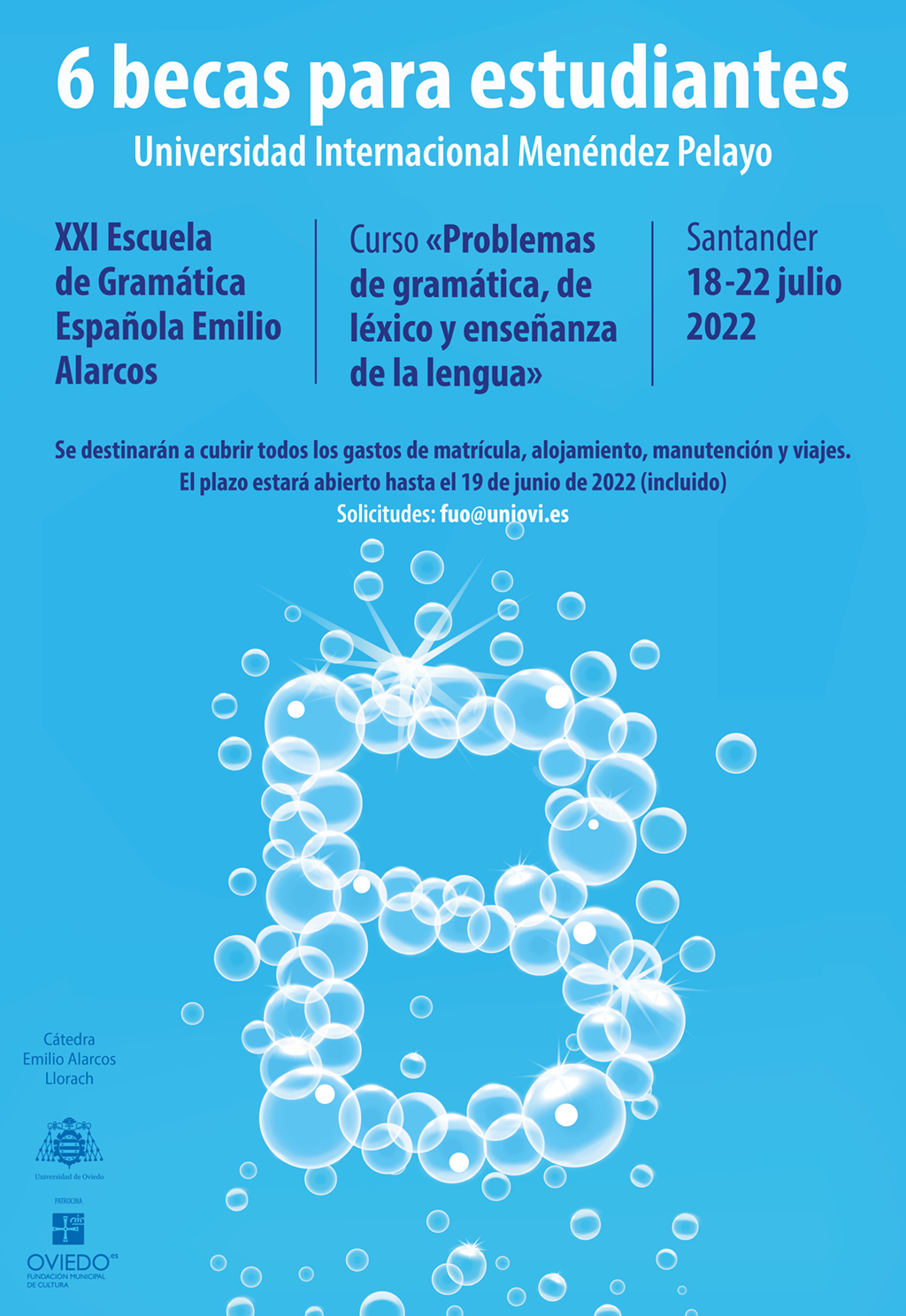 La Fundación Universidad de Oviedo, en el marco de la Cátedra Emilio Alarcos de la Universidad de Oviedo, convoca seis ayudas de estudio, de 450 euros cada una, para la asistencia al curso de verano titulado Problemas de gramática, de léxico y enseñanza de la lengua, dentro de la XXI Escuela de Gramática Española Emilio Alarcos que tendrán lugar en la Universidad Internacional Menéndez Pelayo, durante los días 18 al 22 de julio.