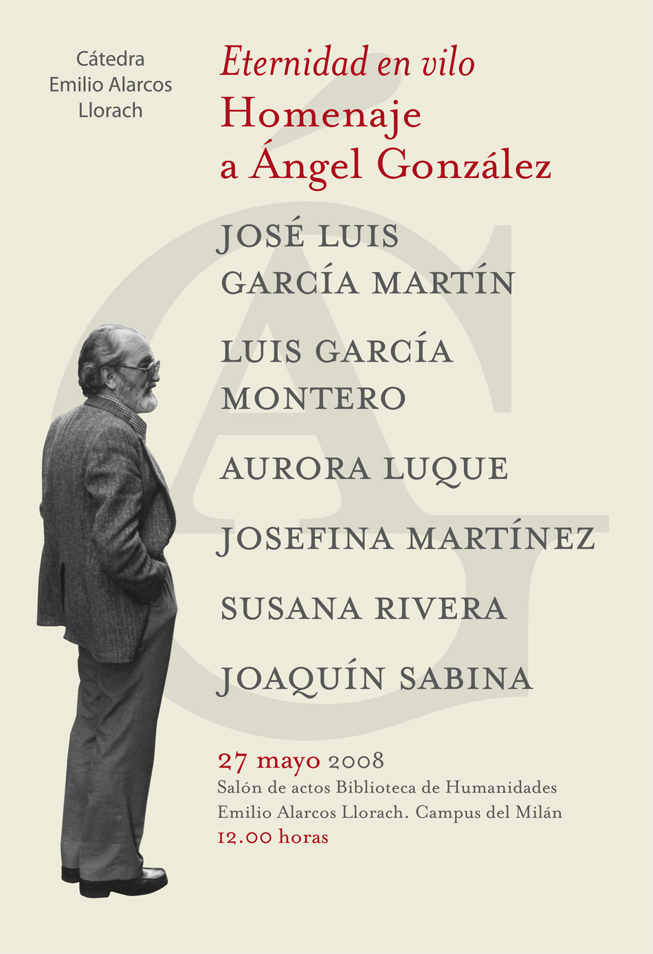 Como homenaje al poeta ovetense Ángel González, recientemente fallecido, se celebra en el salón de actos de la Biblioteca de Humanidades Emilio Alarcos, en el Campus de Milán, un recital poético con el título Eternidad en vilo, que preside el Vicerrector de Extensión Universitaria, José Antonio Cecchini. Intervienen los poetas José Luis García Martín, Luis García Monterio y Aurora Luque, Susana Rivera, profesora y viuda del poeta, el cantante Joaquín Sabina y la Directora de la Cátedra Josefina Martínez Álvarez.