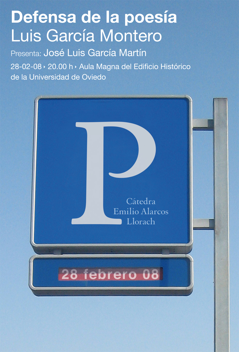 En el Aula Magna del Edificio Histórico de esta Universidad, conferencia del poeta y catedrático de Literatura Española, de la Universidad de Granada, Luis García Montero, con el título Defensa de la poesía. Bajo la presidencia de la Secretaría General de la Universidad de Oviedo, Margarita Fuente, presenta el acto Josefina Martínez Álvarez, directora de la Cátedra y presenta al conferenciante el también profesor y poeta José Luis García Martín.